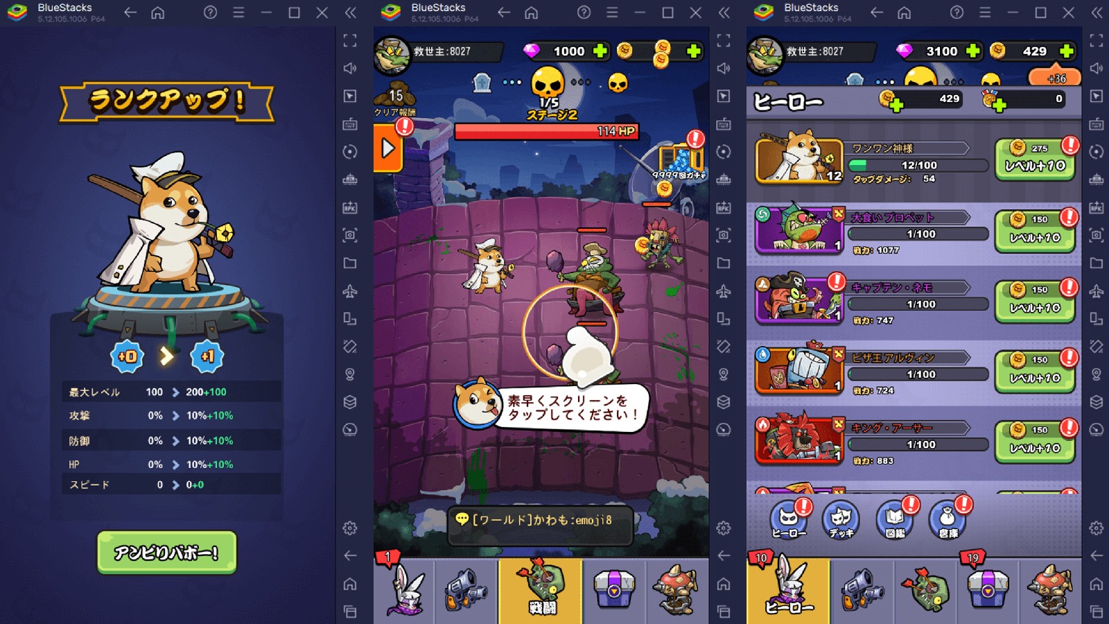 タップして敵を倒していきゴールドや宝箱をいっぱいゲットしながら、ワンワン神様や仲間になったペットヒーローたちをどんどん育てていきましょう!